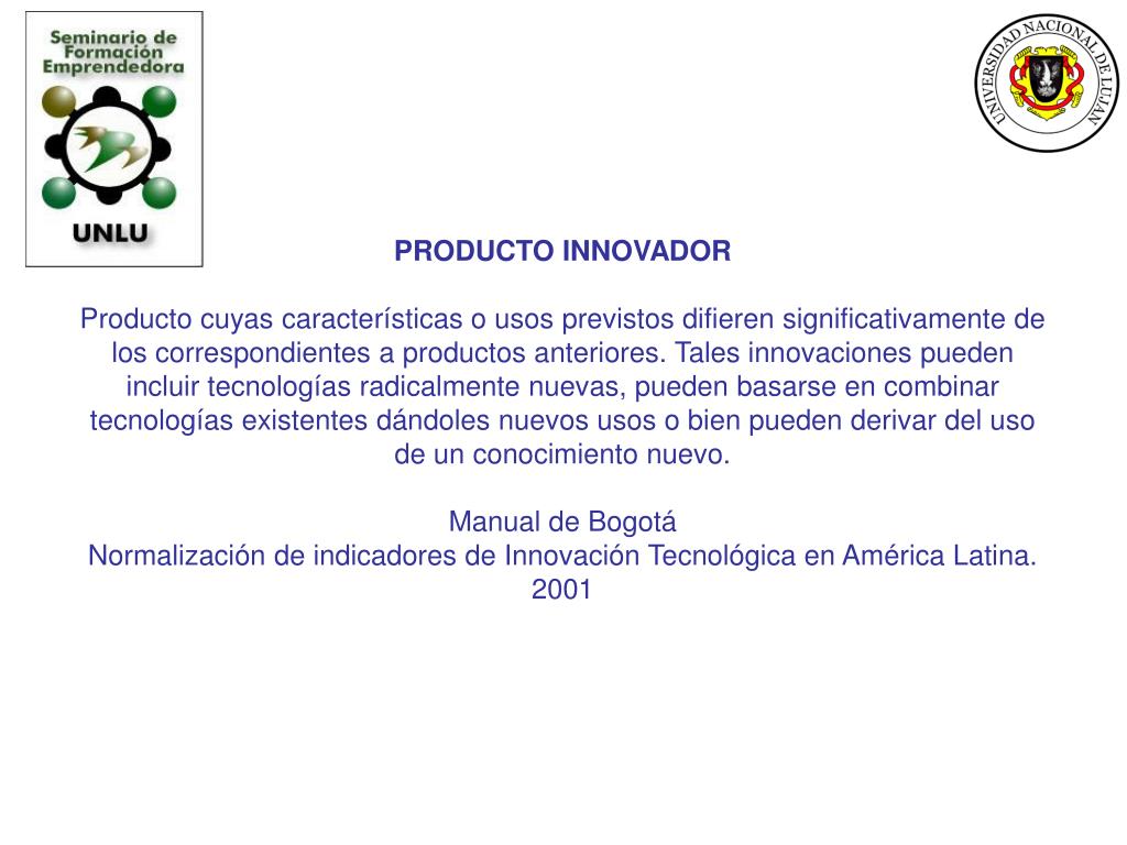 PRODUCTO INNOVADORProducto cuyas características o usos previstos difieren significativamente de los correspondientes a productos anteriores. Tales innovaciones pueden incluir tecnologías radicalmente nuevas, pueden basarse en combinar tecnologías existentes dándoles nuevos usos o bien pueden derivar del uso de un conocimiento nuevo.Manual de BogotáNormalización de indicadores de Innovación Tecnológica en América Latina. 2001