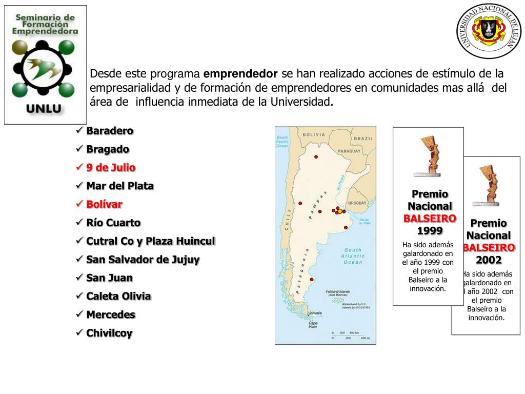 Premio Nacional BALSEIRO 2002 Premio Nacional BALSEIRO 1999 Ha sido además galardonado en el año 2002 con el premio Balseiro a la innovación. Ha sido además galardonado en el año 1999 con el premio Balseiro a la innovación. Desde este programa emprendedor se han realizado acciones de estímulo de la empresarialidad y de formación de emprendedores en comunidades mas allá del área de influencia inmediata de la Universidad. • Baradero • Bragado • 9 de Julio • Mar del Plata • Bolívar • Río Cuarto • Cutral Co y Plaza Huincul • San Salvador de Jujuy • San Juan • Caleta Olivia • Mercedes • Chivilcoy