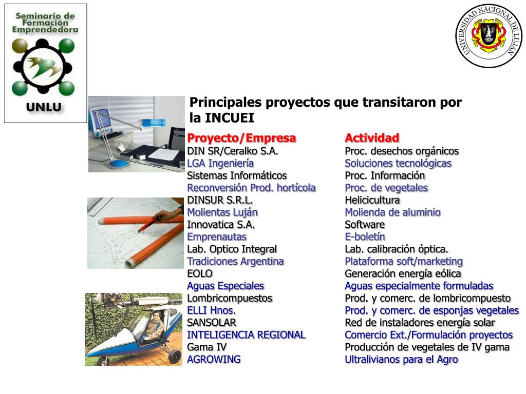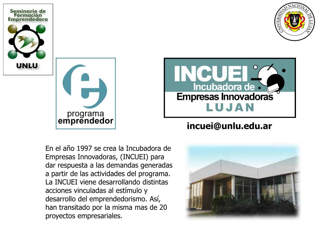 Desde el año 1994 funciona en la Universidad Nacional de Luján, un programa orientado a estimular y desarrollar el potencial emprendedor AREAS COMPLEMENTARIAS DE TRABAJO Formación Empresarial Líneas de Investigación Comunicación Institucional Incubadora (INCUEI) Nace a partir de la necesidad de generar un espacio para la identificación, planeamiento, puesta en marcha y desarrollo de emprendimientos de base tecnológica, productiva y social.