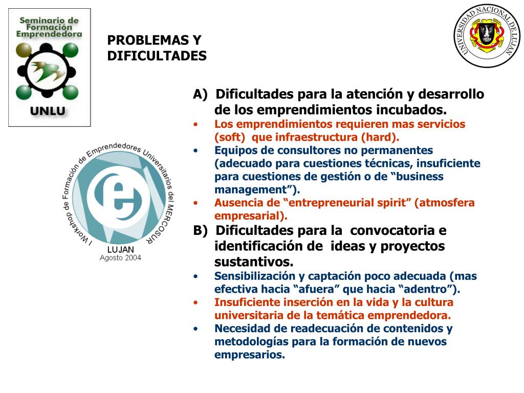 PROBLEMAS Y DIFICULTADES • A) Dificultades para la atención y desarrollo de los emprendimientos incubados. • Los emprendimientos requieren mas servicios (soft) que infraestructura (hard). • Equipos de consultores no permanentes (adecuado para cuestiones técnicas, insuficiente para cuestiones de gestión o de “business management”). • Ausencia de “entrepreneurial spirit” (atmosfera empresarial). • B) Dificultades para la convocatoria e identificación de ideas y proyectos sustantivos. • Sensibilización y captación poco adecuada (mas efectiva hacia “afuera” que hacia “adentro”). • Insuficiente inserción en la vida y la cultura universitaria de la temática emprendedora. • Necesidad de readecuación de contenidos y metodologías para la formación de nuevos empresarios.