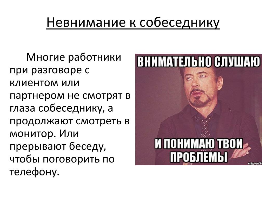 Невнимание к собеседнику Многие работники при разговоре с клиентом или партнером не смотрят в глаза собеседнику, а продолжают смотреть в монитор. Или прерывают беседу, чтобы поговорить по телефону.