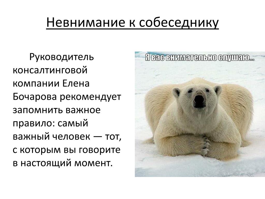 Невнимание к собеседнику Руководитель консалтинговой компании Елена Бочарова рекомендует запомнить важное правило: самый важный человек — тот, с которым вы говорите в настоящий момент.