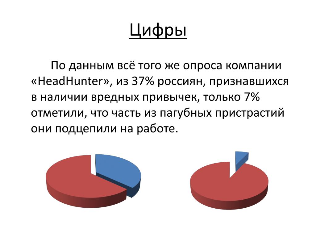 Цифры По данным всё того же опроса компании «HeadHunter», из 37% россиян, признавшихся в наличии вредных привычек, только 7% отметили, что часть из пагубных пристрастий они подцепили на работе.
