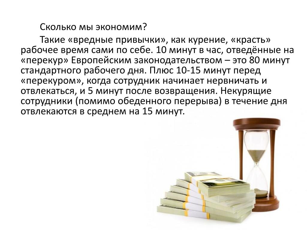 Сколько мы экономим? Такие «вредные привычки», как курение, «красть» рабочее время сами по себе. 10 минут в час, отведённые на «перекур» Европейским законодательством – это 80 минут стандартного рабочего дня. Плюс 10-15 минут перед «перекуром», когда сотрудник начинает нервничать и отвлекаться, и 5 минут после возвращения. Некурящие сотрудники (помимо обеденного перерыва) в течение дня отвлекаются в среднем на 15 минут.