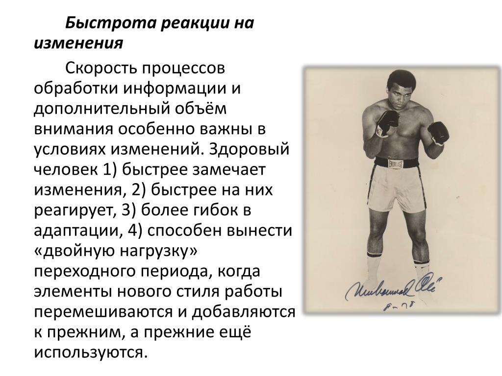 Быстрота реакции на изменения Скорость процессов обработки информации и дополнительный объём внимания особенно важны в условиях изменений. Здоровый человек 1) быстрее замечает изменения, 2) быстрее на них реагирует, 3) более гибок в адаптации, 4) способен вынести «двойную нагрузку» переходного периода, когда элементы нового стиля работы перемешиваются и добавляются к прежним, а прежние ещё используются.