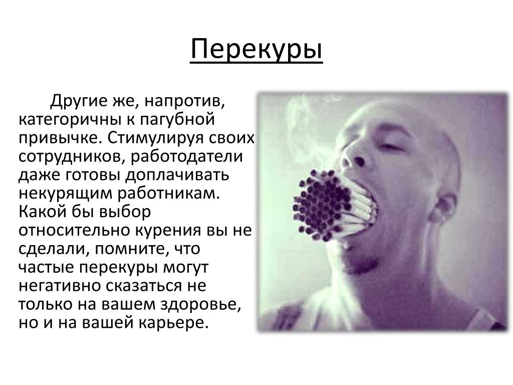 Перекуры Другие же, напротив, категоричны к пагубной привычке. Стимулируя своих сотрудников, работодатели даже готовы доплачивать некурящим работникам. Какой бы выбор относительно курения вы не сделали, помните, что частые перекуры могут негативно сказаться не только на вашем здоровье, но и на вашей карьере.