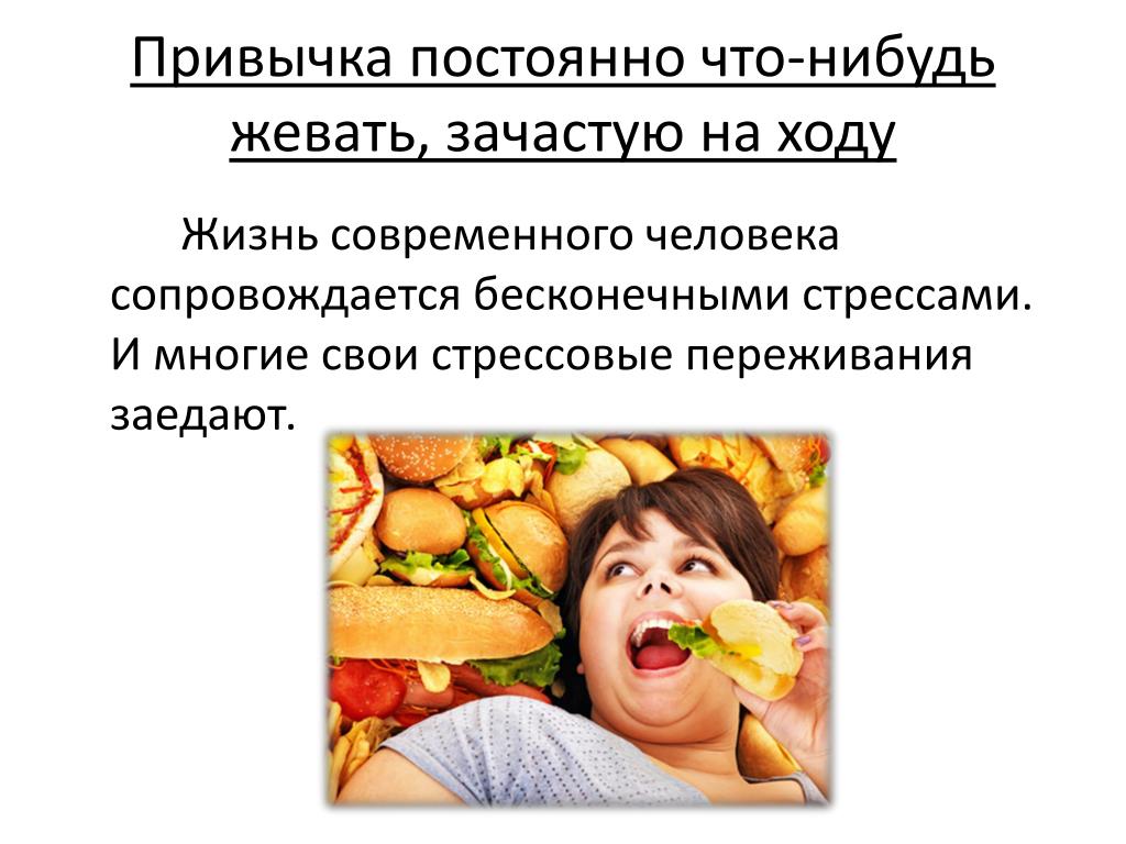 Привычка постоянно что-нибудь жевать, зачастую на ходу Жизнь современного человека сопровождается бесконечными стрессами. И многие свои стрессовые переживания заедают.