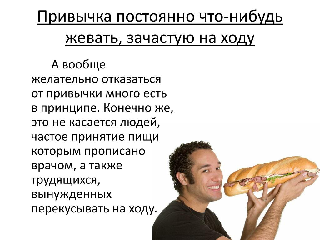 Привычка постоянно что-нибудь жевать, зачастую на ходу А вообще желательно отказаться от привычки много есть в принципе. Конечно же, это не касается людей, частое принятие пищи которым прописано врачом, а также трудящихся, вынужденных перекусывать на ходу.