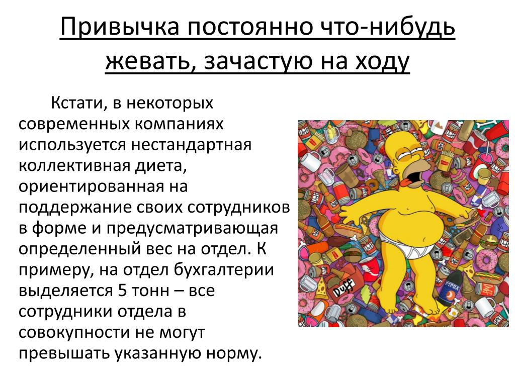 Привычка постоянно что-нибудь жевать, зачастую на ходу Кстати, в некоторых современных компаниях используется нестандартная коллективная диета, ориентированная на поддержание своих сотрудников в форме и предусматривающая определенный вес на отдел. К примеру, на отдел бухгалтерии выделяется 5 тонн – все сотрудники отдела в совокупности не могут превышать указанную норму.