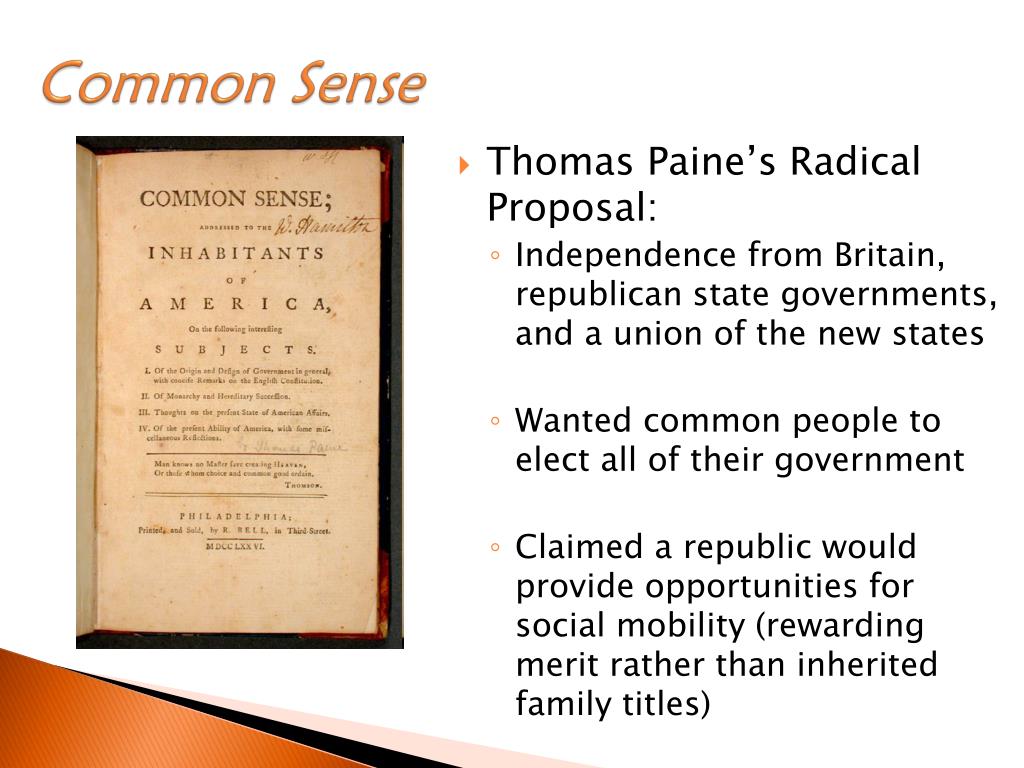 Common Sense • Thomas Paine’s Radical Proposal: • Independence from Britain, republican state governments, and a union of the new states • Wanted common people to elect all of their government • Claimed a republic would provide opportunities for social mobility (rewarding merit rather than inherited family titles)