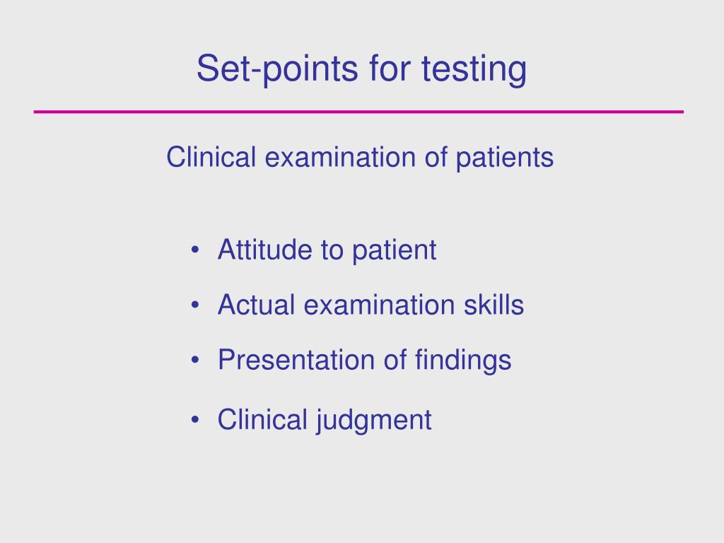 Set-points for testing • Attitude to patient • Actual examination skills • Presentation of findings • Clinical judgment Clinical examination of patients