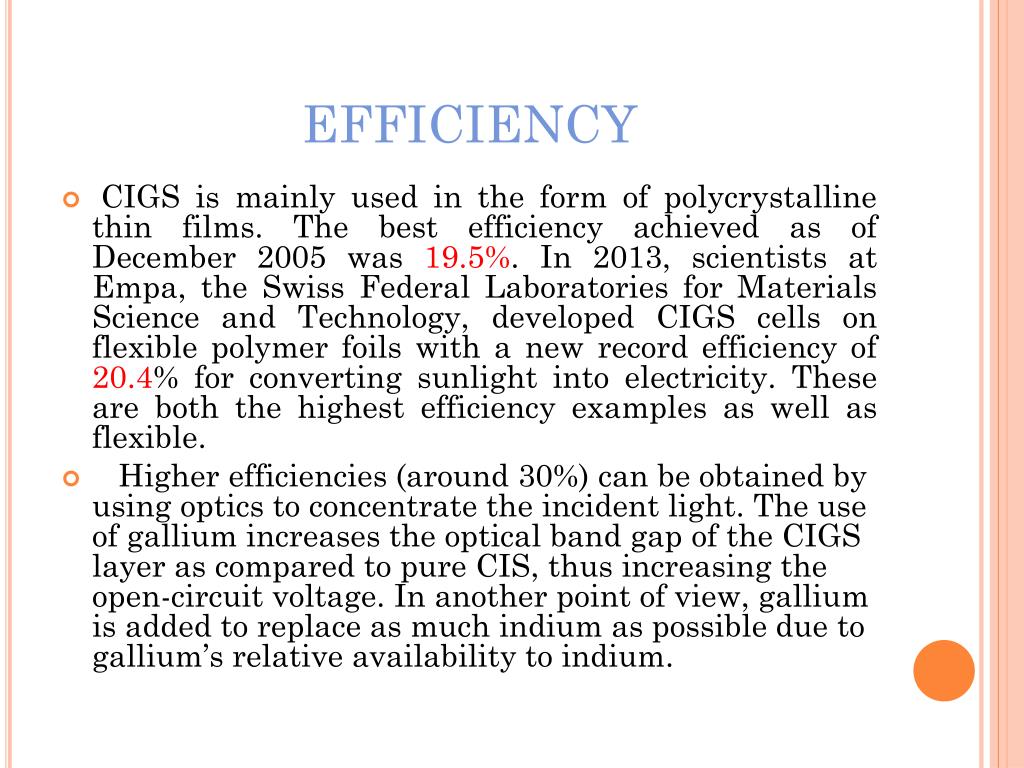 EFFICIENCY • CIGS is mainly used in the form of polycrystalline thin films. The best efficiency achieved as of December 2005 was 19.5%. In 2013, scientists at Empa, the Swiss Federal Laboratories for Materials Science and Technology, developed CIGS cells on flexible polymer foils with a new record efficiency of 20.4% for converting sunlight into electricity. These are both the highest efficiency examples as well as flexible. • Higher efficiencies (around 30%) can be obtained by using optics to concentrate the incident light. The use of gallium increases the optical band gap of the CIGS layer as compared to pure CIS, thus increasing the open-circuit voltage. In another point of view, gallium is added to replace as much indium as possible due to gallium’s relative availability to indium.