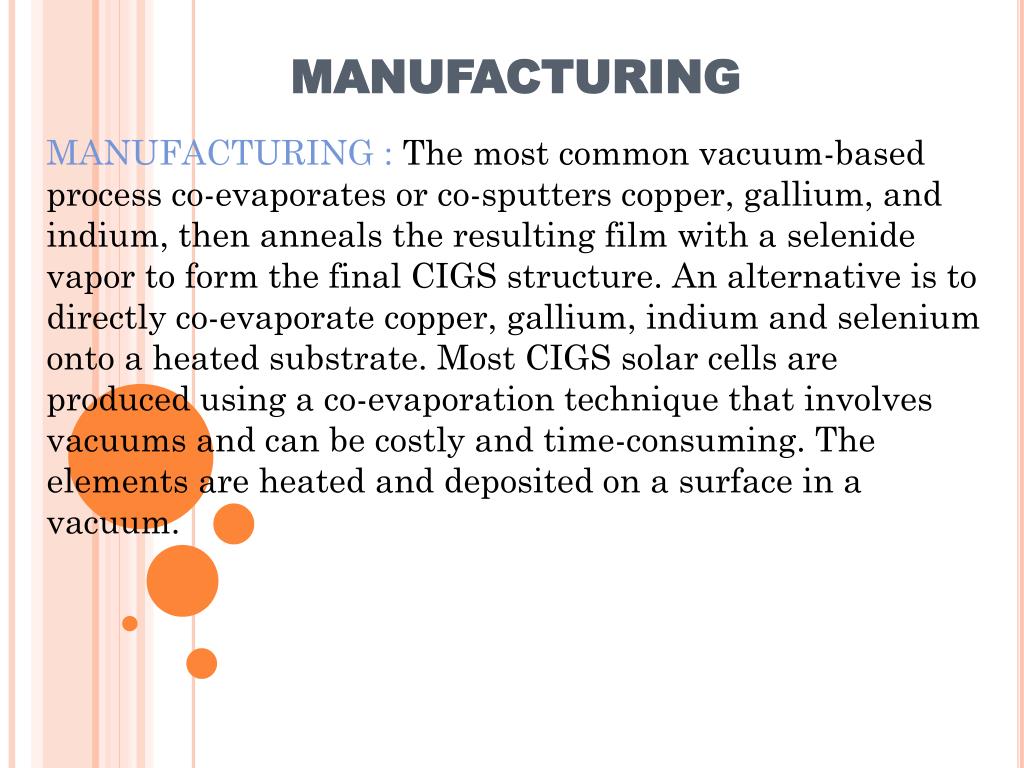 MANUFACTURING MANUFACTURING : The most common vacuum-based process co-evaporates or co-sputters copper, gallium, and indium, then anneals the resulting film with a selenide vapor to form the final CIGS structure. An alternative is to directly co-evaporate copper, gallium, indium and selenium onto a heated substrate.Most CIGS solar cells are produced using a co-evaporation technique that involves vacuums and can be costly and time-consuming. The elements are heated and deposited on a surface in a vacuum.