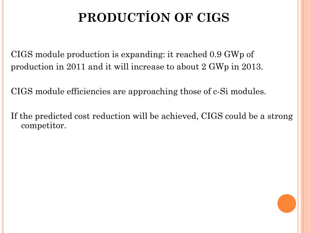 PRODUCTİON OF CIGS CIGS module production is expanding: it reached 0.9 GWpof production in 2011 and it will increase to about 2 GWp in 2013. CIGS module efficiencies are approaching those of c-Si modules. If the predicted cost reduction will be achieved, CIGS could be a strong competitor.