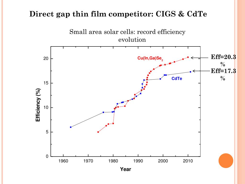 Direct gap thin film competitor: CIGS & CdTe Small area solar cells: record efficiency evolution Eff=20.3% Eff=17.3%