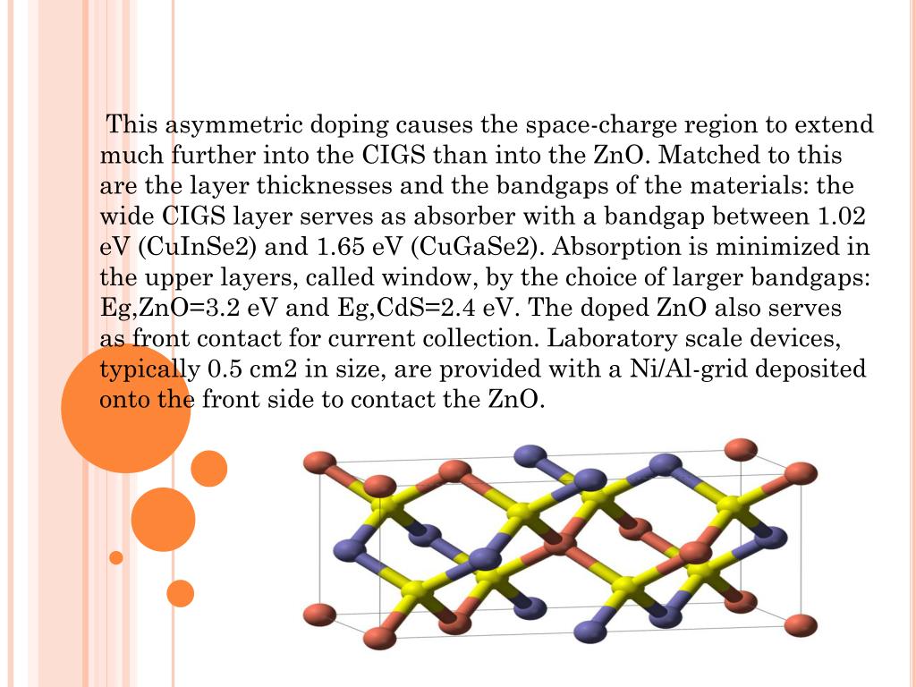 This asymmetric doping causes the space-charge region to extend much further into the CIGS than into the ZnO. Matched to this are the layer thicknesses and the bandgaps of the materials: the wide CIGS layer serves as absorber with a bandgap between 1.02 eV (CuInSe2) and 1.65 eV (CuGaSe2). Absorption is minimized in the upper layers, called window, by the choice of larger bandgaps: Eg,ZnO=3.2 eV and Eg,CdS=2.4 eV. The doped ZnO also serves as front contact for current collection. Laboratory scale devices, typically 0.5 cm2 in size, are provided with a Ni/Al-grid deposited onto the front side to contact the ZnO.