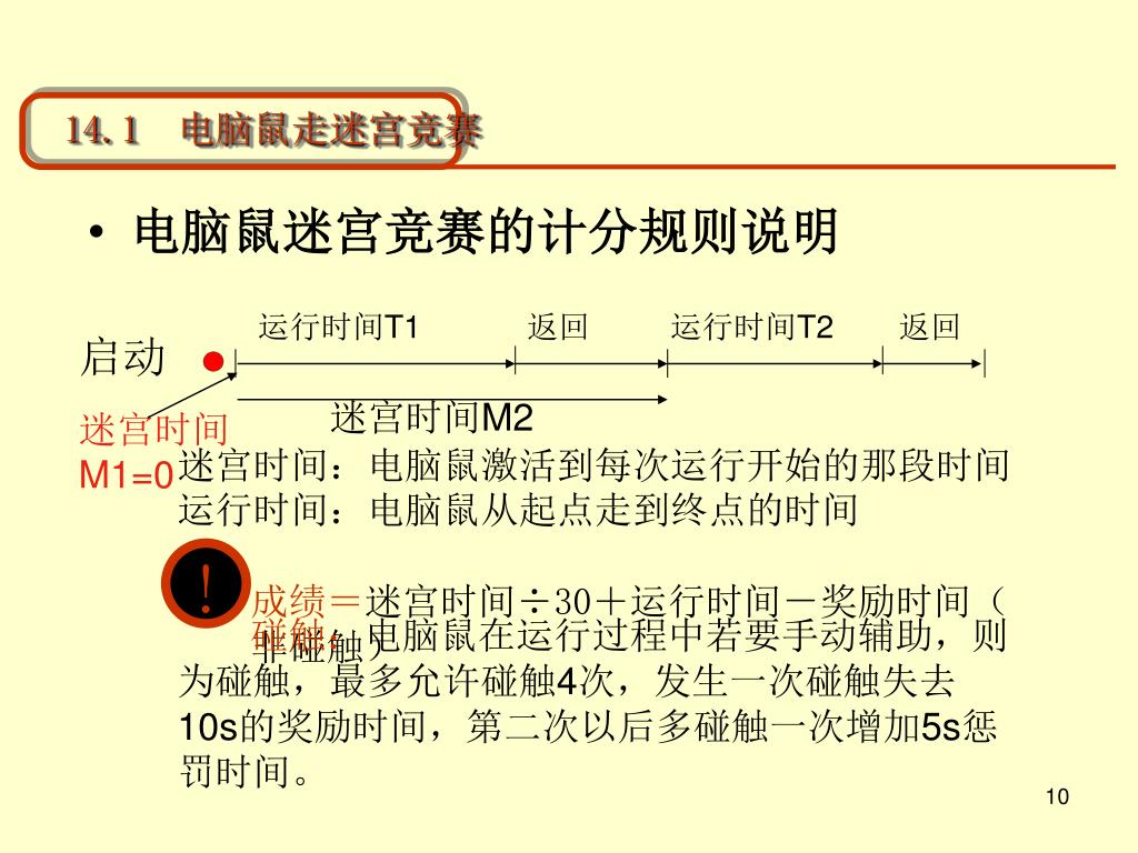14.1 电脑鼠走迷宫竞赛 • 电脑鼠迷宫竞赛的计分规则说明 运行时间T1 返回 运行时间T2 返回 启动 迷宫时间M2 迷宫时间 M1=0 迷宫时间:电脑鼠激活到每次运行开始的那段时间 运行时间:电脑鼠从起点走到终点的时间 ! 成绩=迷宫时间÷30+运行时间-奖励时间(非碰触) 碰触:电脑鼠在运行过程中若要手动辅助,则为碰触,最多允许碰触4次,发生一次碰触失去10s的奖励时间,第二次以后多碰触一次增加5s惩罚时间。