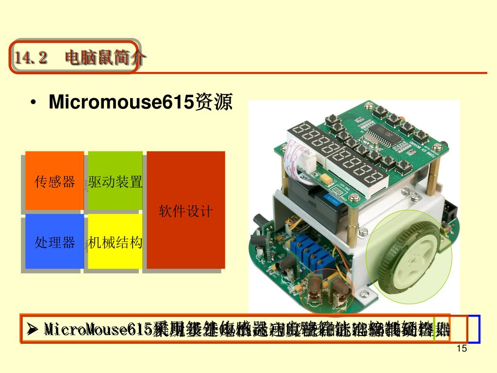 14.2 电脑鼠简介 • 电脑鼠诠释了肢体、感官、脑的协调工作 感官:传感器 肢体:电机 脑:处理器