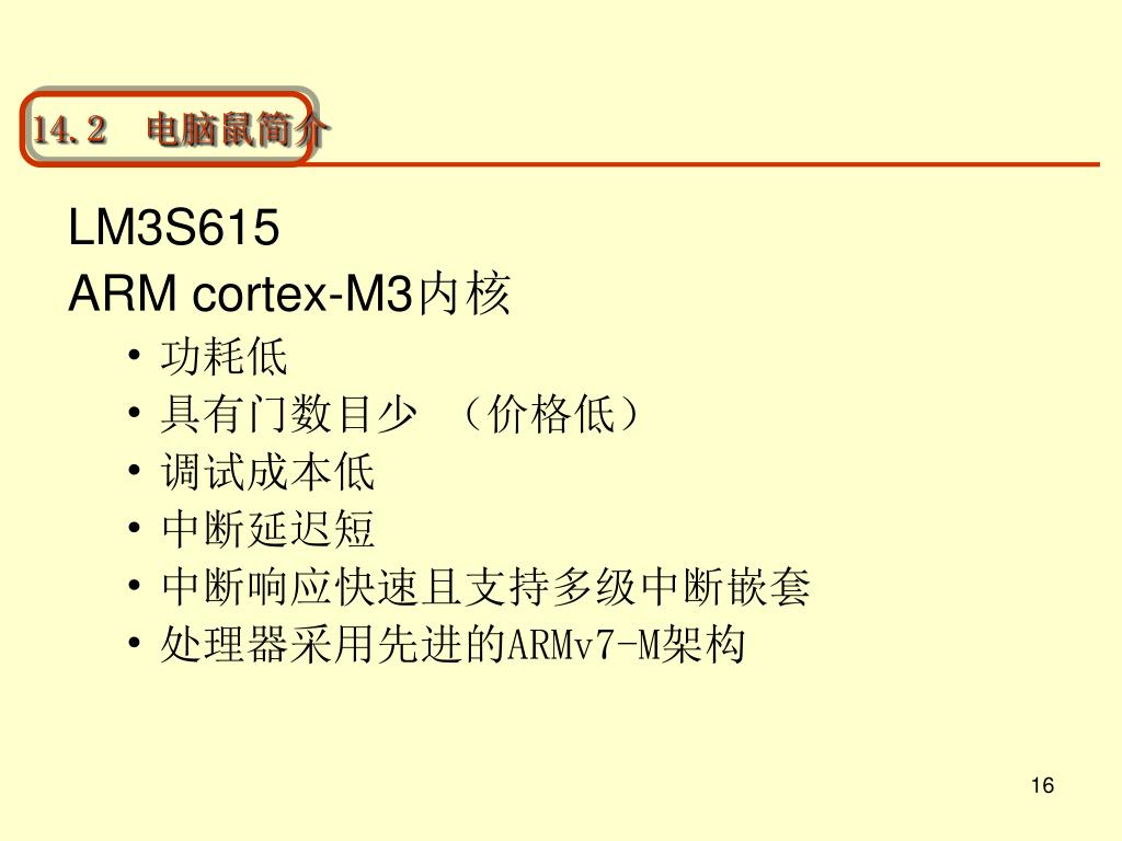 14.2 电脑鼠简介 LM3S615 ARM cortex-M3内核 • 功耗低 • 具有门数目少 (价格低) • 调试成本低 • 中断延迟短 • 中断响应快速且支持多级中断嵌套 • 处理器采用先进的ARMv7-M架构