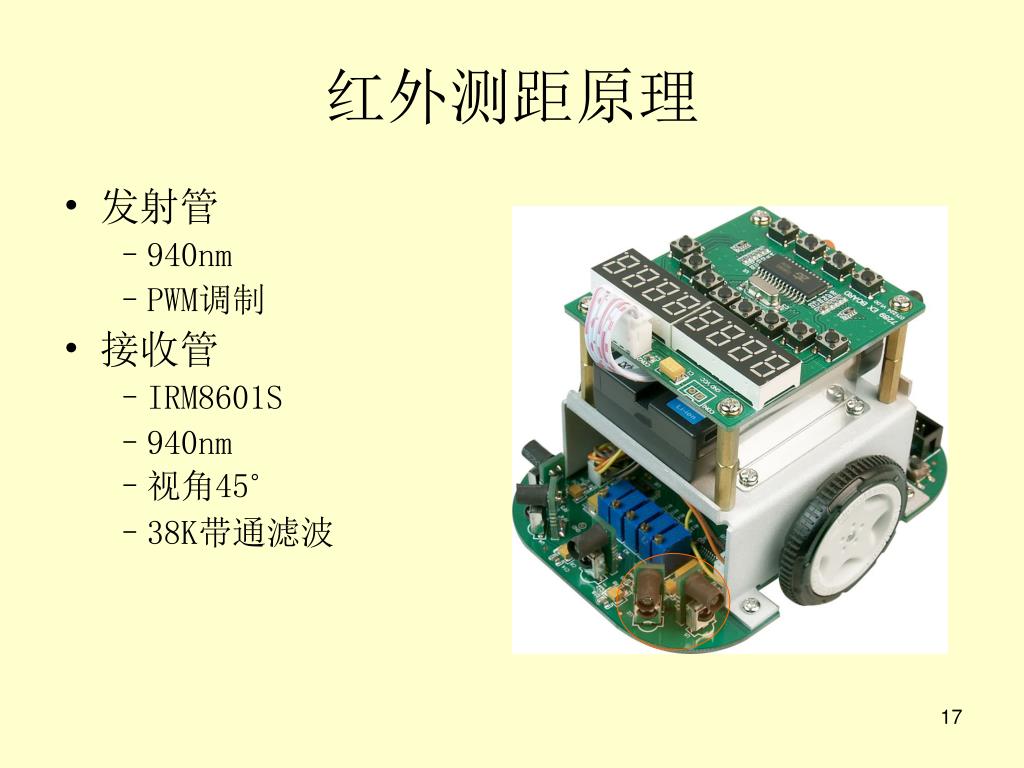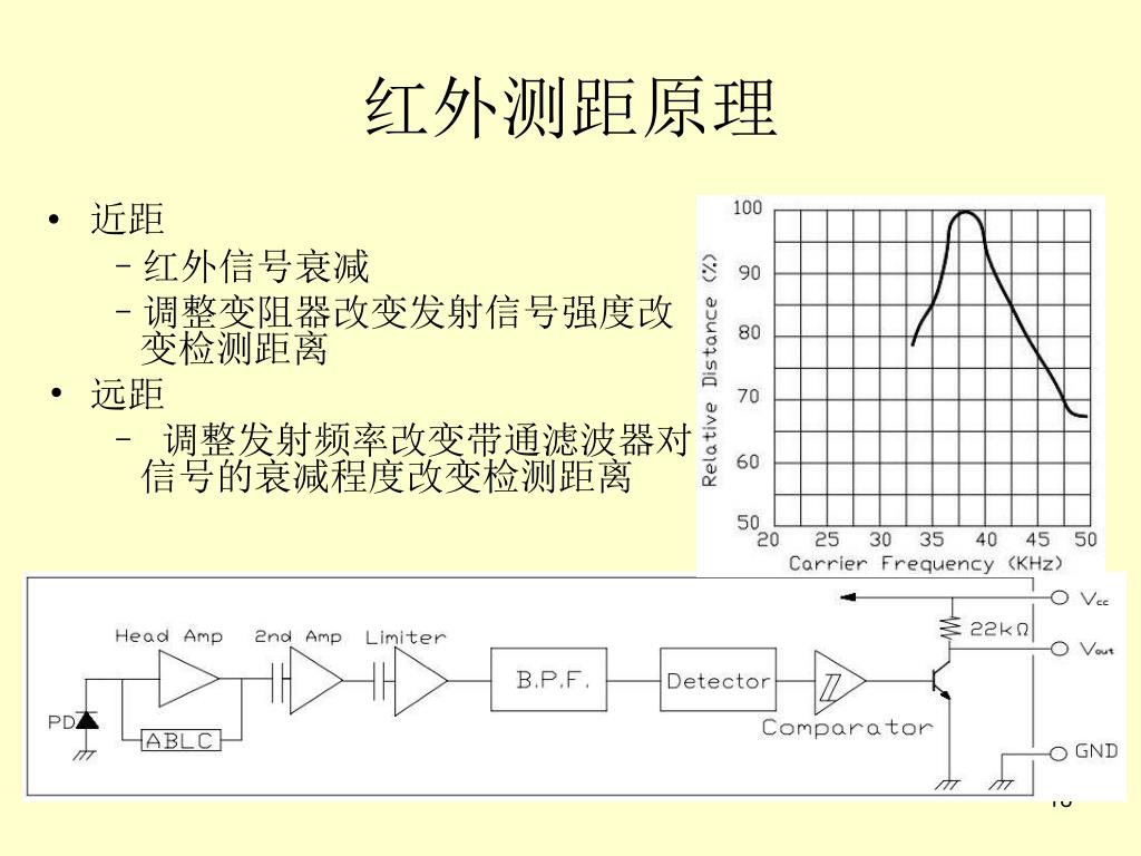 红外测距原理 • 近距 • 红外信号衰减 • 调整变阻器改变发射信号强度改变检测距离 • 远距 • 调整发射频率改变带通滤波器对信号的衰减程度改变检测距离