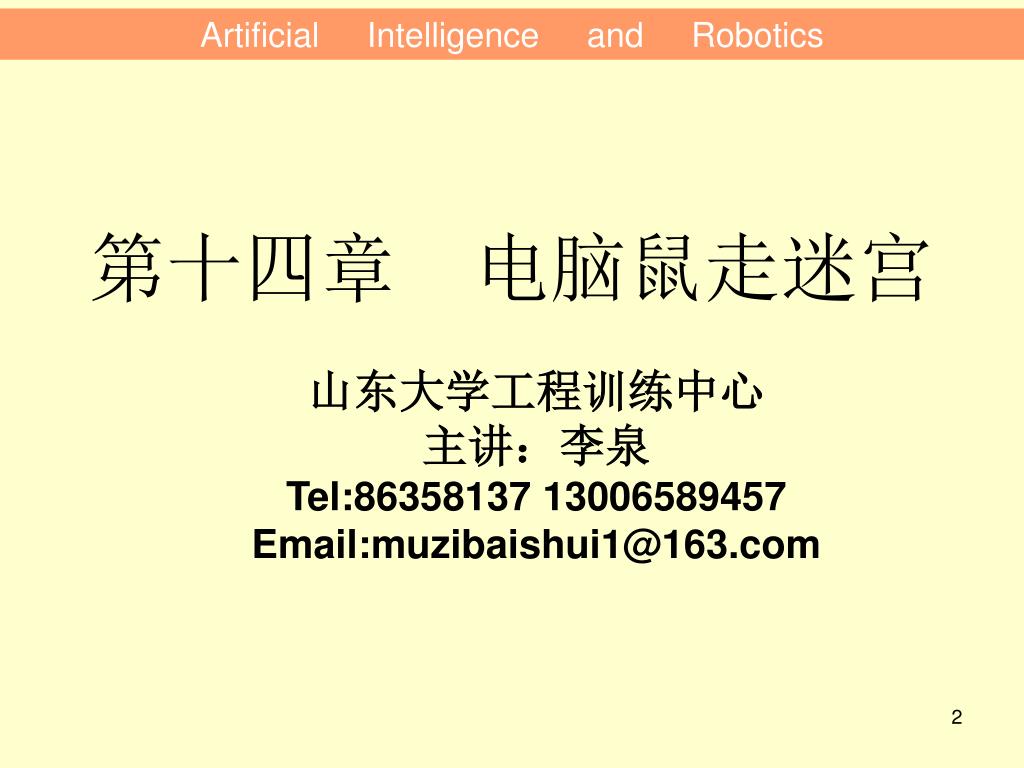 Artificial Intelligence and Robotics. 山东大学创新教育通识核心课程 人工智能与机器人 cyj@sdu.edu.cn 86358137 、 88399323 山东大学. Artificial Intelligence and Robotics. 第十四章 电脑鼠走迷宫. 山东大学工程训练中心 主讲:李泉 Tel:86358137 13006589457 Email:muzibaishui1@163.com. 第十四章 电脑鼠走迷宫. 1. 2. 3. 4.