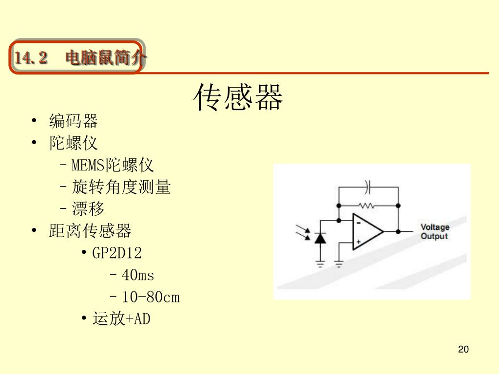 传感器 14.2 电脑鼠简介 • 编码器 • 陀螺仪 • MEMS陀螺仪 • 旋转角度测量 • 漂移 • 距离传感器 • GP2D12 • 40ms • 10-80cm • 运放+AD