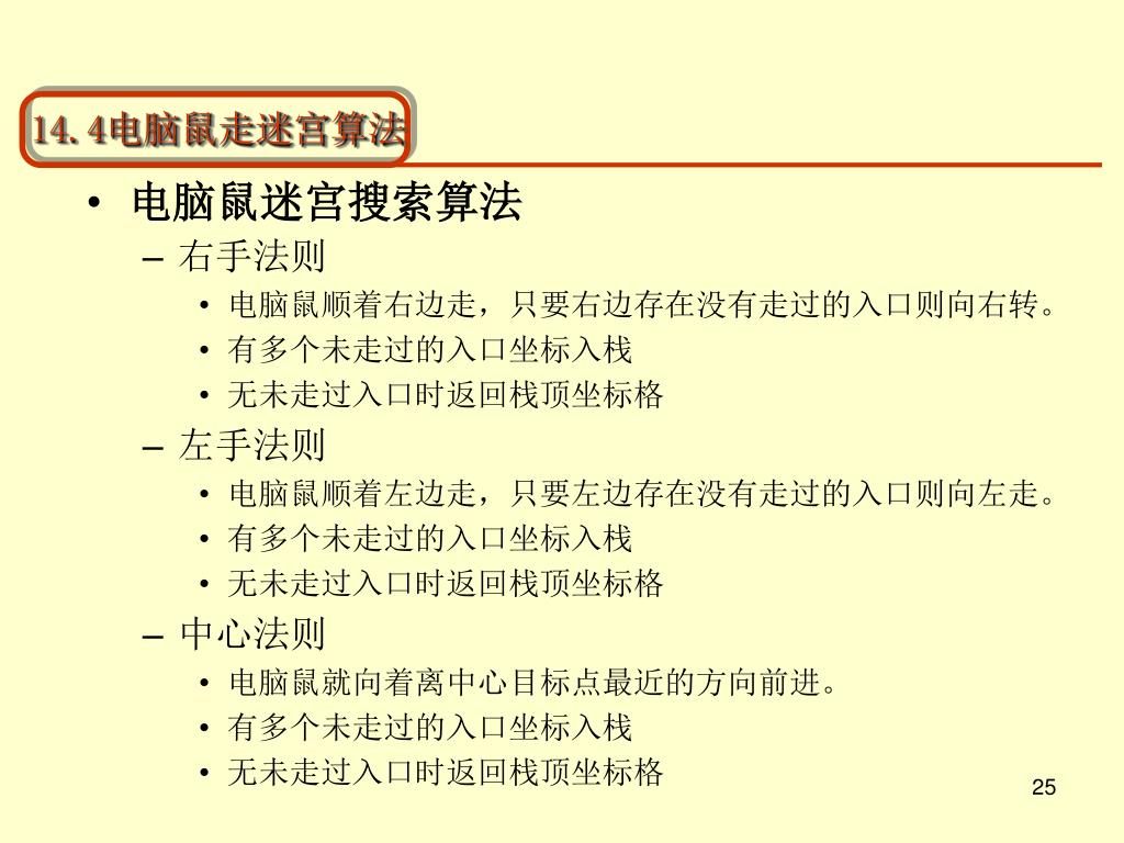 14.4电脑鼠走迷宫算法 • 电脑鼠迷宫搜索算法 • 右手法则 • 电脑鼠顺着右边走,只要右边存在没有走过的入口则向右转。 • 有多个未走过的入口坐标入栈 • 无未走过入口时返回栈顶坐标格 • 左手法则 • 电脑鼠顺着左边走,只要左边存在没有走过的入口则向左走。 • 有多个未走过的入口坐标入栈 • 无未走过入口时返回栈顶坐标格 • 中心法则 • 电脑鼠就向着离中心目标点最近的方向前进。 • 有多个未走过的入口坐标入栈 • 无未走过入口时返回栈顶坐标格