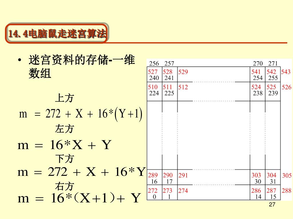 14.4电脑鼠走迷宫算法 • 迷宫资料的存储-一维数组 上方 左方 下方 右方