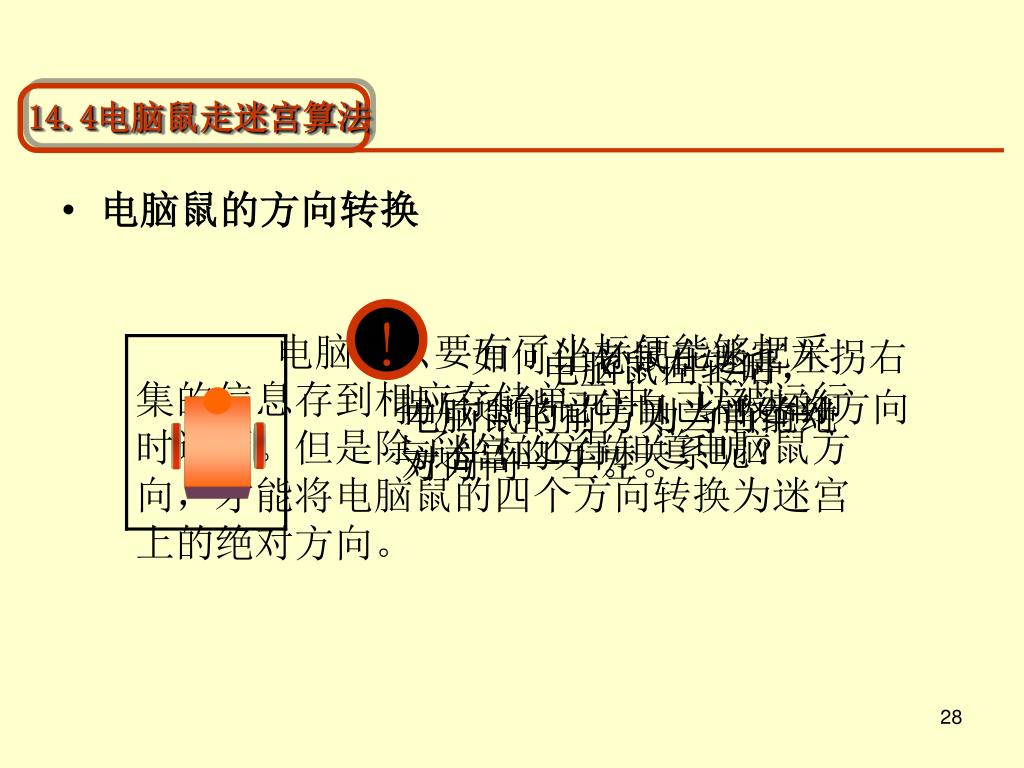 14.4电脑鼠走迷宫算法 • 电脑鼠的方向转换 ! 电脑鼠只要有了坐标便能够把采集的信息存到相应存储单元中,以被运行时遍历。但是除了坐标还得知道电脑鼠方向,才能将电脑鼠的四个方向转换为迷宫上的绝对方向。 如何让老鼠在迷宫左拐右拐后还能记住自己前进的方向与迷宫的方向关系呢? 电脑鼠向上时,电脑鼠的前方为当前绝对方向——上。 电脑鼠左转后,电脑鼠的前方则为当前绝对方向——左。