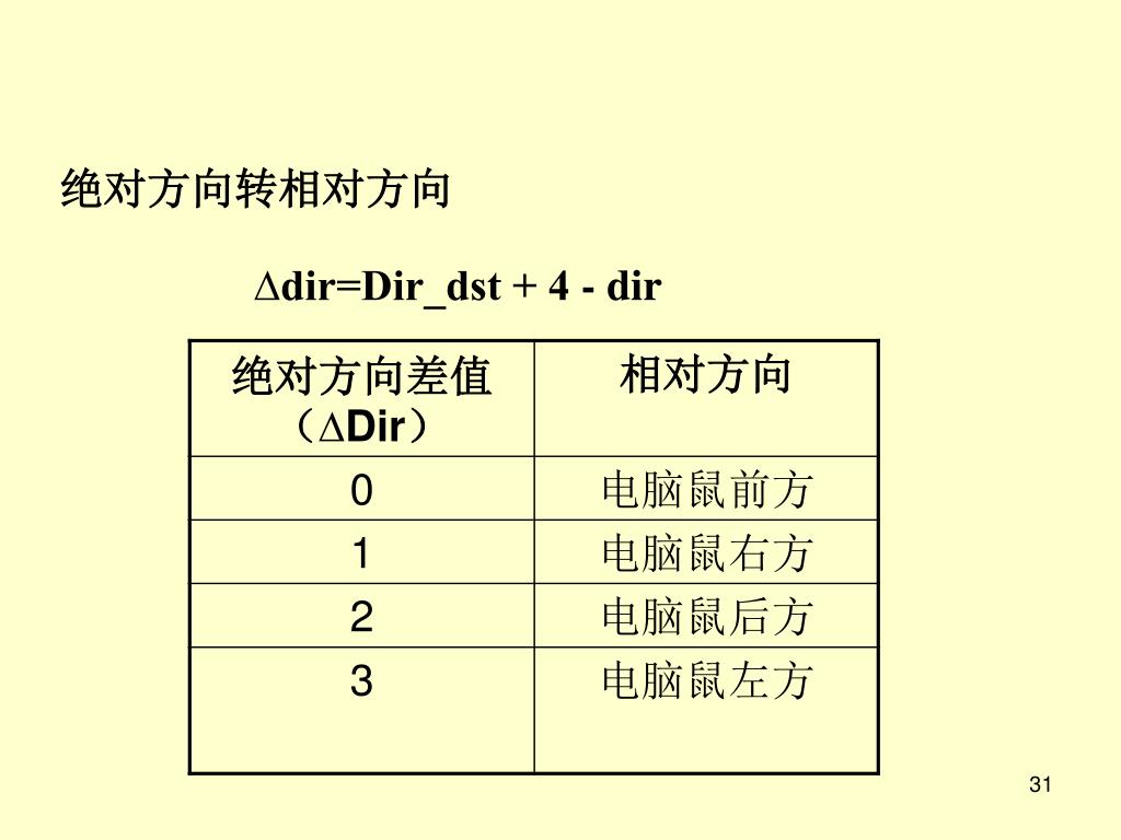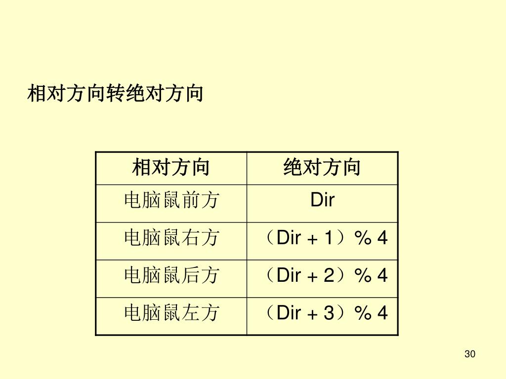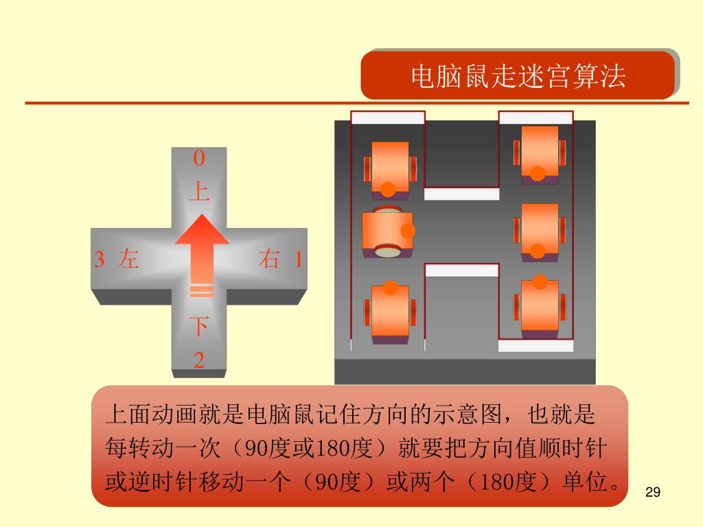 电脑鼠走迷宫算法 0 上 3 左 右 1 下 2 上面动画就是电脑鼠记住方向的示意图,也就是 每转动一次(90度或180度)就要把方向值顺时针 或逆时针移动一个(90度)或两个(180度)单位。