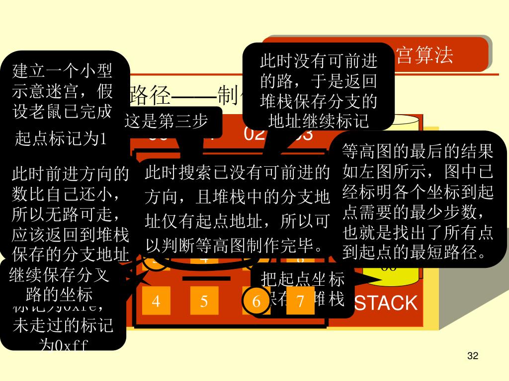 电脑鼠走迷宫算法 此时没有可前进的路,于是返回堆栈保存分支的地址继续标记 建立一个小型示意迷宫,假设老鼠已完成对迷宫的搜索,即掌握了迷宫地图。 • 求最短路径——制作等高图: 这是第三步 13 起点标记为1 等高图的最后的结果如左图所示,图中已经标明各个坐标到起点需要的最少步数,也就是找出了所有点到起点的最短路径。 地址出栈 此时前进方向的数比自己还小,所以无路可走,应该返回到堆栈保存的分支地址 于是保存分叉路的坐标,并随便选一个方向前进,这不影响结果 此时搜索已没有可前进的 方向,且堆栈中的分支地 址仅有起点地址,所以可 以判断等高图制作完毕。 标记为2,表示第二步到达的方格,后面的以此类推 1 4 5 8 32 22 此时迷宫的前方和右方都有路 2 3 6 7 10 20 3 4 5 8 00 继续保存分叉路的坐标 把起点坐标保存到堆栈 把走过的方格标记为0xfe,未走过的标记为0xff 9 8 4 7 5 10 6 7 11 12