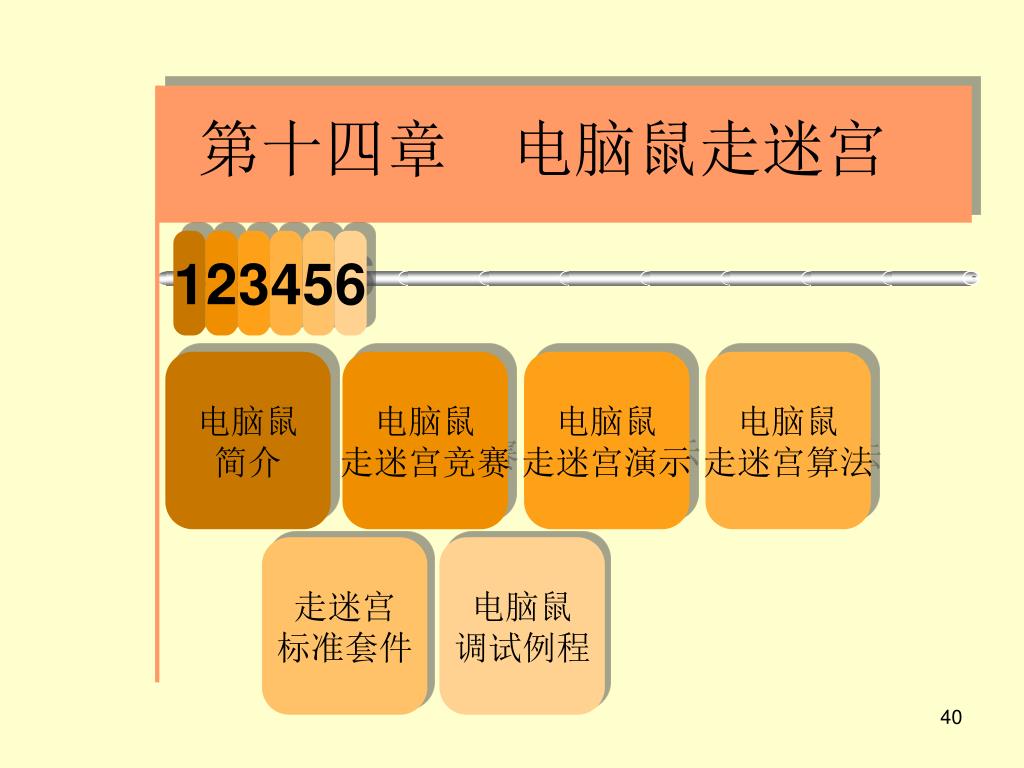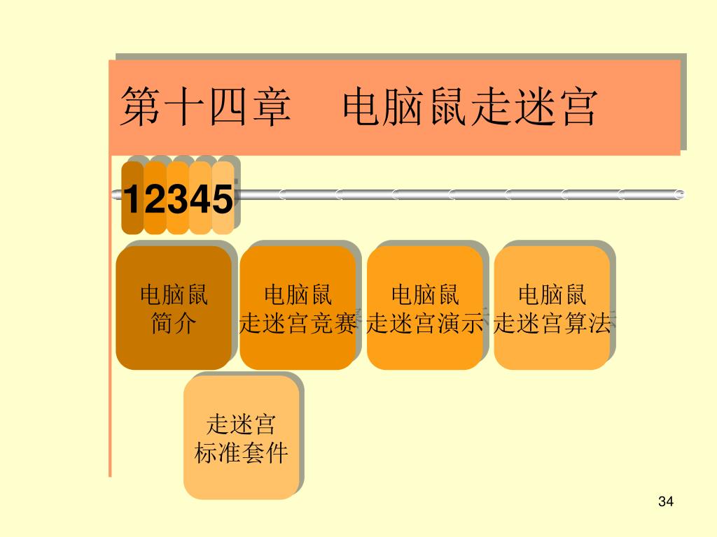第十四章 电脑鼠走迷宫 1 2 3 4 电脑鼠 走迷宫竞赛 电脑鼠 简介 电脑鼠 走迷宫演示 电脑鼠 走迷宫算法