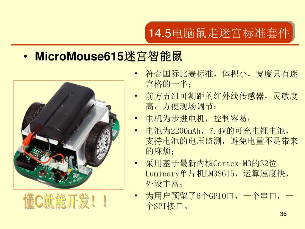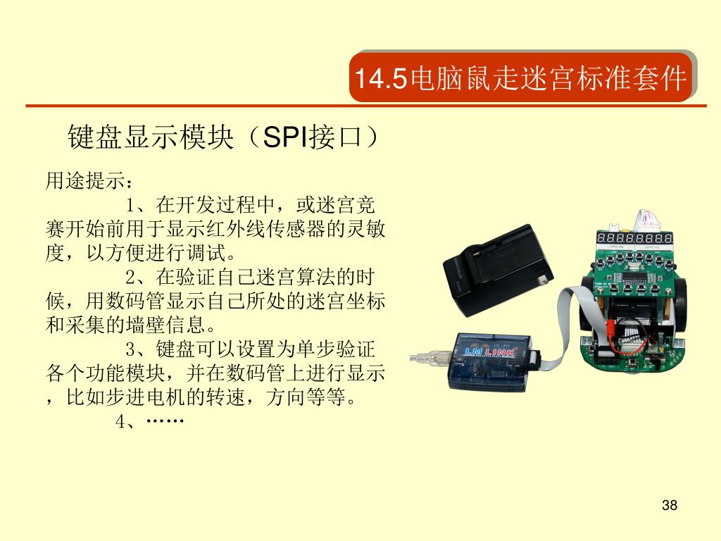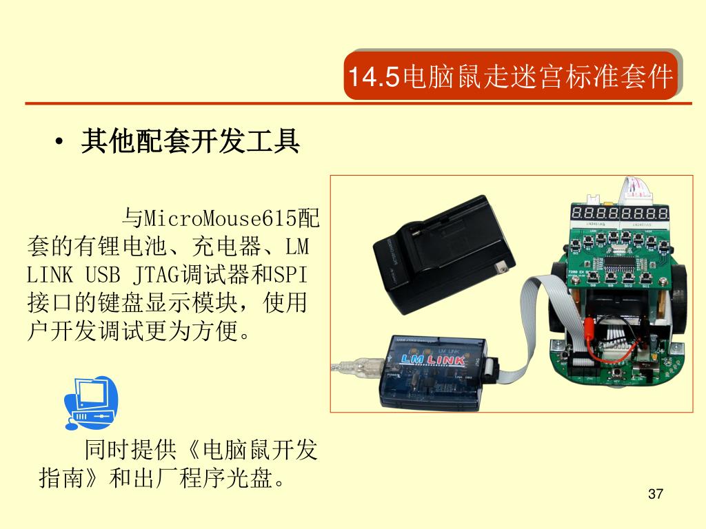 14.5电脑鼠走迷宫标准套件 • 其他配套开发工具 与MicroMouse615配套的有锂电池、充电器、LM LINK USB JTAG调试器和SPI接口的键盘显示模块,使用户开发调试更为方便。 同时提供《电脑鼠开发指南》和出厂程序光盘。
