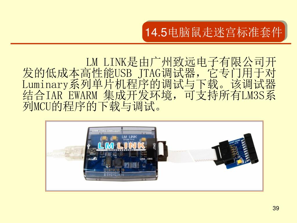 14.5电脑鼠走迷宫标准套件 LM LINK是由广州致远电子有限公司开发的低成本高性能USB JTAG调试器,它专门用于对Luminary系列单片机程序的调试与下载。该调试器结合IAR EWARM 集成开发环境,可支持所有LM3S系列MCU的程序的下载与调试。