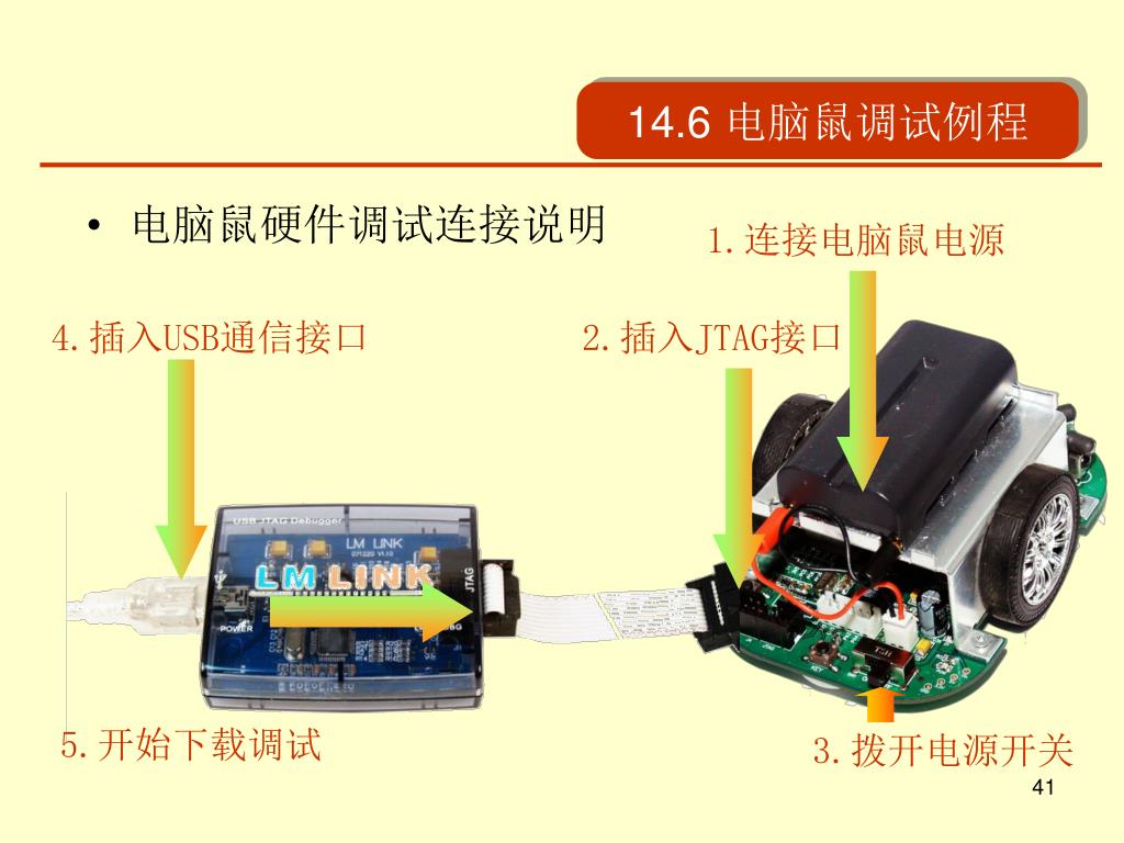 14.6 电脑鼠调试例程 • 电脑鼠硬件调试连接说明 1.连接电脑鼠电源 4.插入USB通信接口 2.插入JTAG接口 5.开始下载调试 3.拨开电源开关