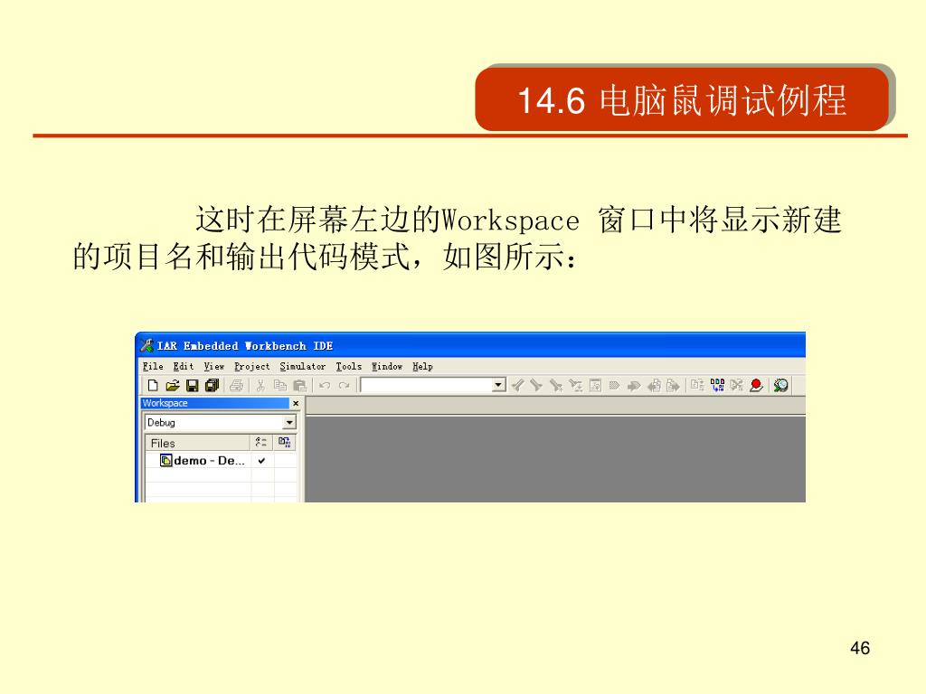 14.6 电脑鼠调试例程 这时在屏幕左边的Workspace 窗口中将显示新建的项目名和输出代码模式,如图所示: