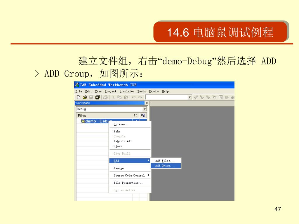 14.6 电脑鼠调试例程 建立文件组,右击“demo-Debug”然后选择 ADD > ADD Group,如图所示: