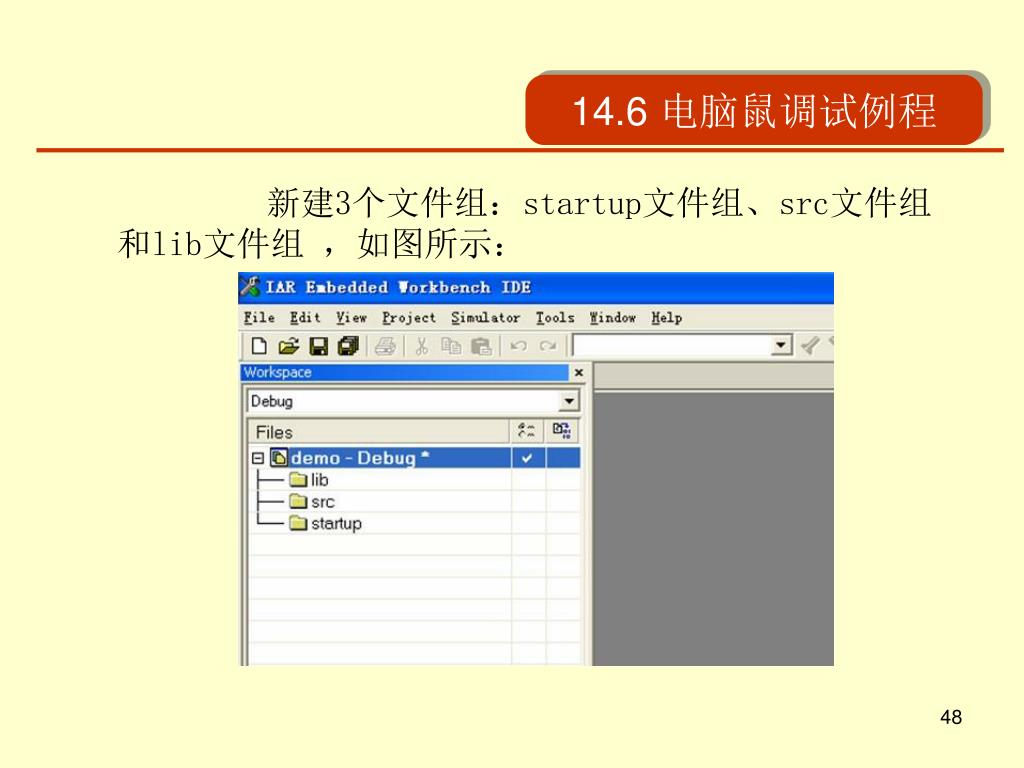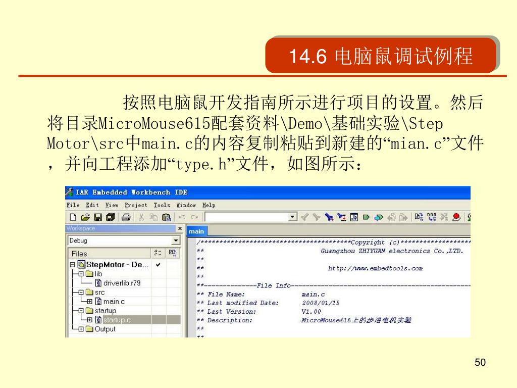 14.6 电脑鼠调试例程 • 实验例程:步进电机控制 打开IAR EWARM集成开发环境,建立工作区和新建一个项目: