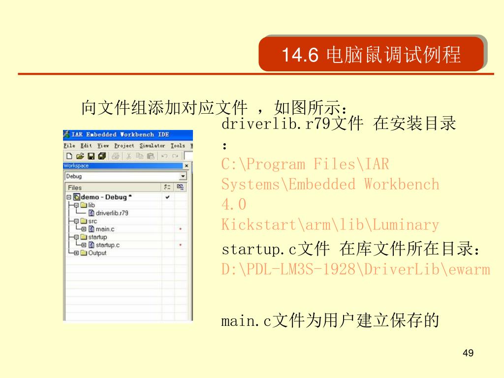 14.6 电脑鼠调试例程 向文件组添加对应文件 ,如图所示: driverlib.r79文件 在安装目录: C:\Program Files\IAR Systems\Embedded Workbench 4.0 Kickstart\arm\lib\Luminary startup.c文件 在库文件所在目录: D:\PDL-LM3S-1928\DriverLib\ewarm main.c文件为用户建立保存的