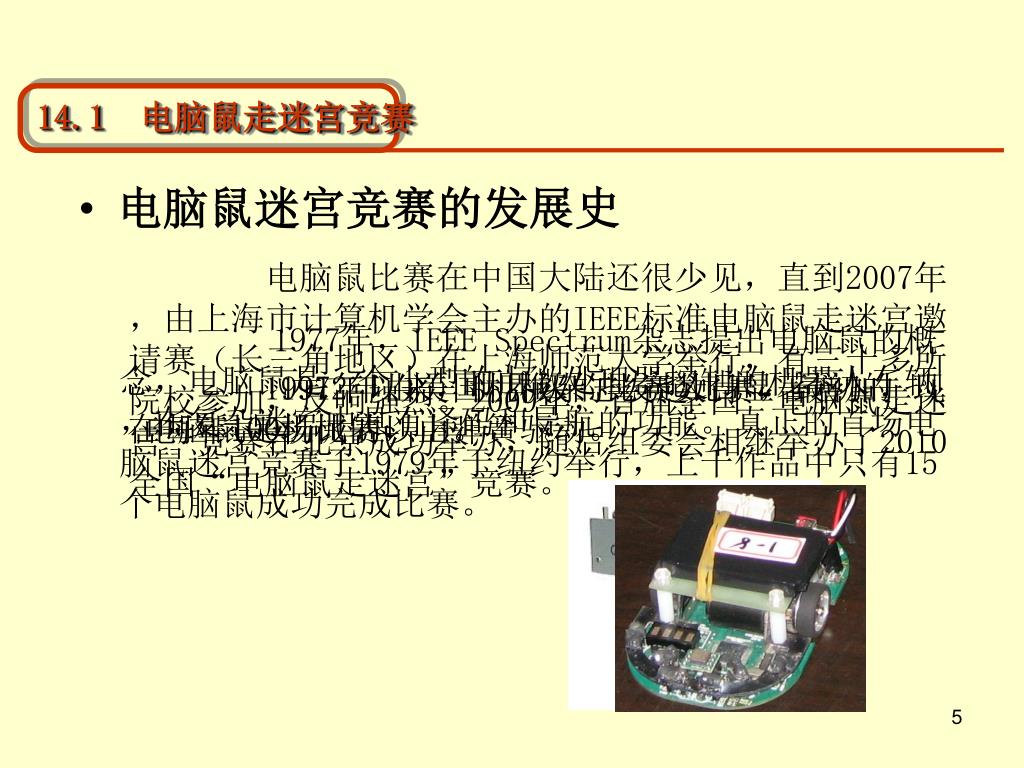 14.1 电脑鼠走迷宫竞赛 • 电脑鼠迷宫竞赛的发展史 电脑鼠比赛在中国大陆还很少见,直到2007年,由上海市计算机学会主办的IEEE标准电脑鼠走迷宫邀请赛(长三角地区)在上海师范大学举行,有三十多所院校参加,反响强烈。2009年,首届全国“电脑鼠走迷宫”竞赛在北京成功举办,随后组委会相继举办了2010 全国“电脑鼠走迷宫”竞赛。 1977年,IEEE Spectrum杂志提出电脑鼠的概念,电脑鼠是一个小型的由微处理器控制的机器人车辆,在复杂迷宫中具有译码和导航的功能。真正的首场电脑鼠迷宫竞赛于1979年于纽约举行,上千作品中只有15个电脑鼠成功完成比赛。 1991年以来,世界级的比赛数目显著增加,现在每年100场比赛以上。 1972年由美国机械杂志发起比赛,最初的电脑鼠是机械的,由弹簧驱动。