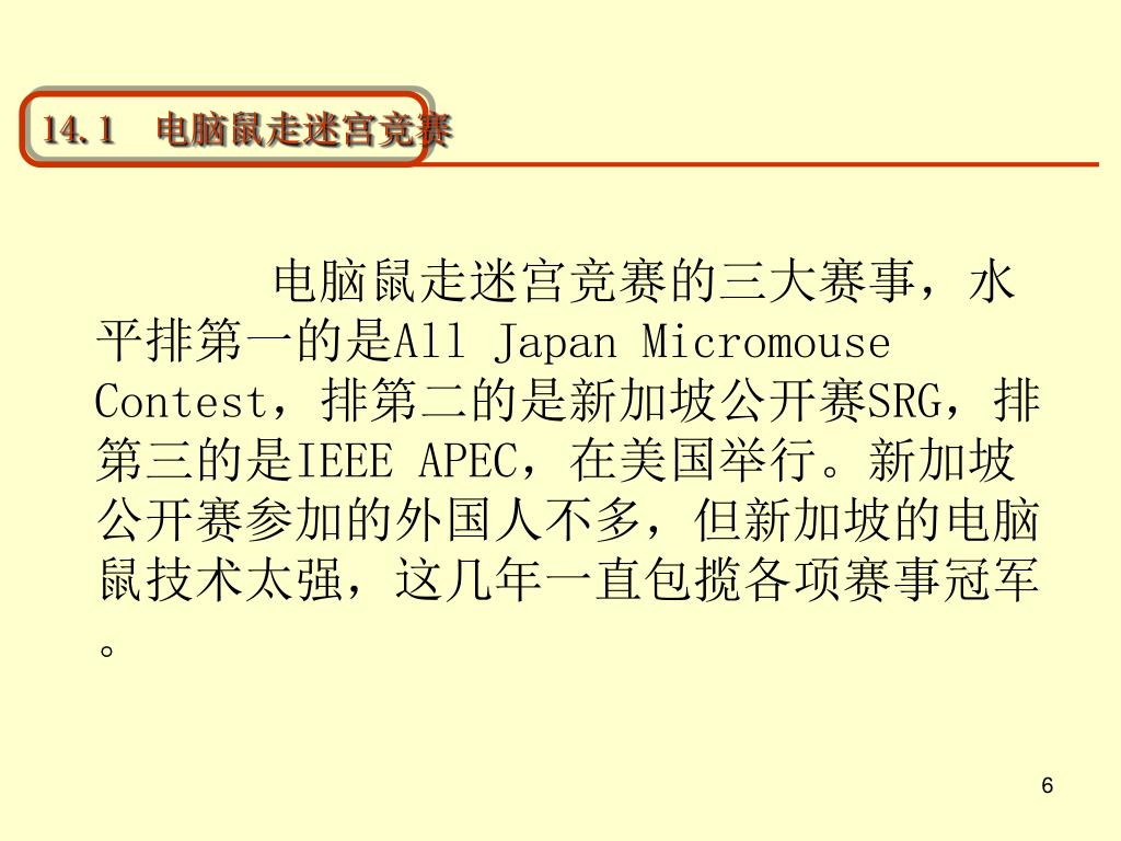 14.1 电脑鼠走迷宫竞赛 电脑鼠走迷宫竞赛的三大赛事,水平排第一的是All Japan Micromouse Contest,排第二的是新加坡公开赛SRG,排第三的是IEEE APEC,在美国举行。新加坡公开赛参加的外国人不多,但新加坡的电脑鼠技术太强,这几年一直包揽各项赛事冠军。
