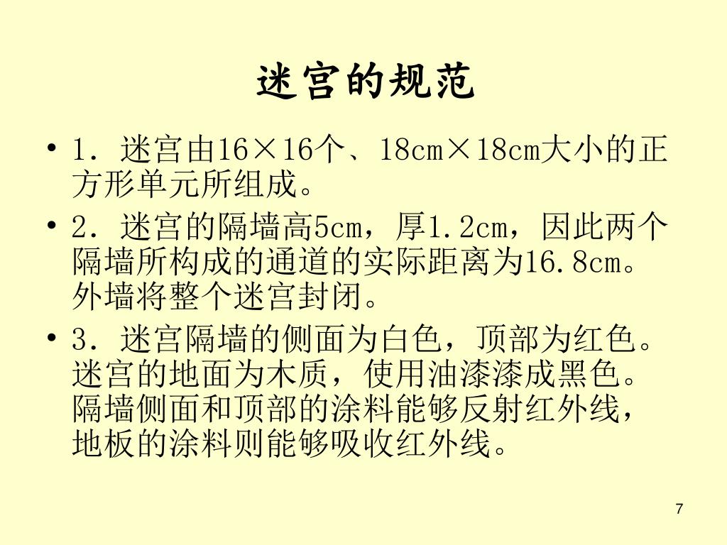 迷宫的规范 • 1.迷宫由16×16个﹑18cm×18cm大小的正方形单元所组成。 • 2.迷宫的隔墙高5cm,厚1.2cm,因此两个隔墙所构成的通道的实际距离为16.8cm。外墙将整个迷宫封闭。 • 3.迷宫隔墙的侧面为白色,顶部为红色。迷宫的地面为木质,使用油漆漆成黑色。隔墙侧面和顶部的涂料能够反射红外线,地板的涂料则能够吸收红外线。