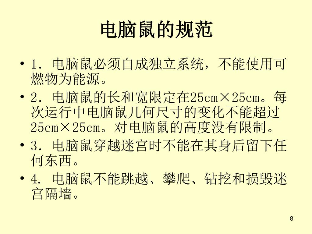 电脑鼠的规范 • 1.电脑鼠必须自成独立系统,不能使用可燃物为能源。 • 2.电脑鼠的长和宽限定在25cm×25cm。每次运行中电脑鼠几何尺寸的变化不能超过25cm×25cm。对电脑鼠的高度没有限制。 • 3.电脑鼠穿越迷宫时不能在其身后留下任何东西。 • 4. 电脑鼠不能跳越、攀爬、钻挖和损毁迷宫隔墙。