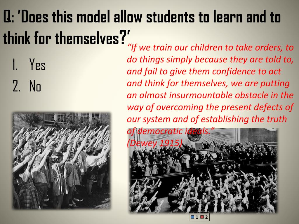 Q: ’Does this model allow students to learn and to think for themselves?’ “If we train our children to take orders, to do things simply because they are told to, and fail to give them confidence to act and think for themselves, we are putting an almost insurmountable obstacle in the way of overcoming the present defects of our system and of establishing the truth of democratic ideals.” (Dewey 1915) • Yes • No