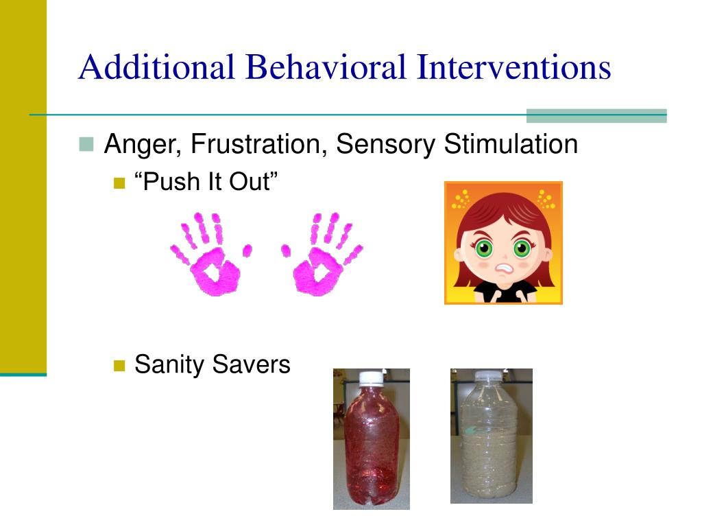 Additional Behavioral Interventions • Anger, Frustration, Sensory Stimulation • “Push It Out” • Sanity Savers