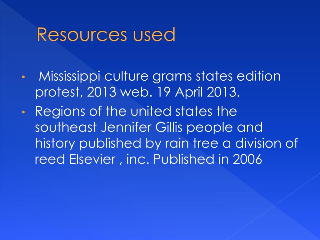 Resources used • Mississippi culture grams states edition protest, 2013 web. 19 April 2013. • Regions of the united states the southeast Jennifer Gillis people and history published by rain tree a division of reed Elsevier , inc. Published in 2006