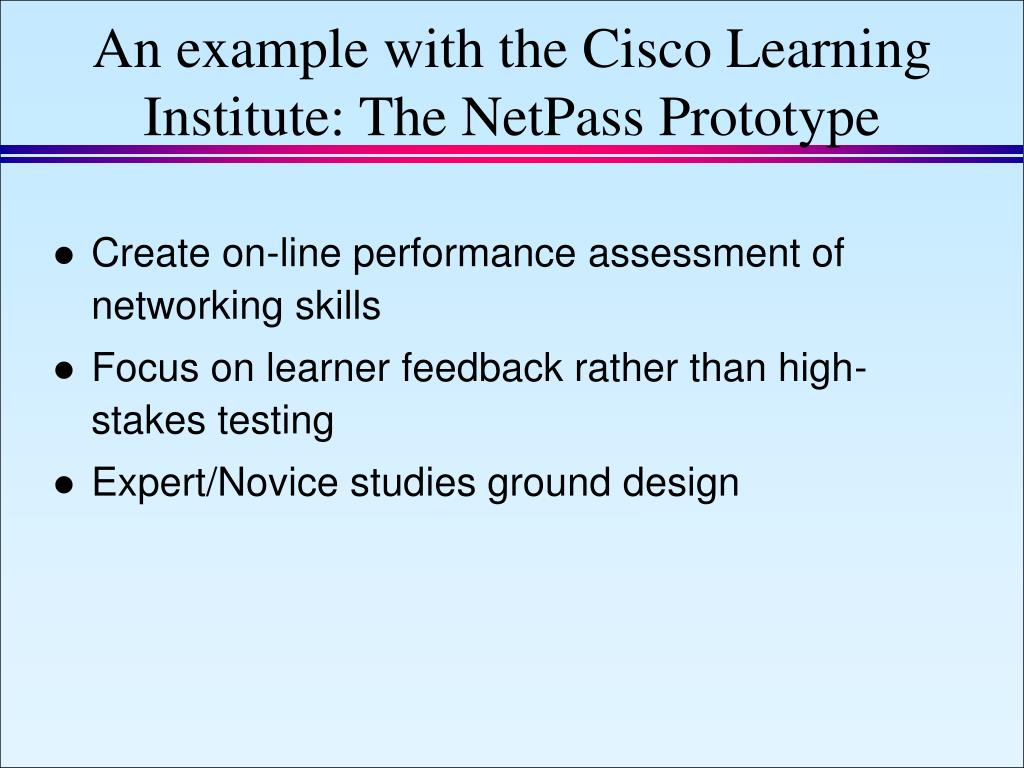 An example with the Cisco Learning Institute: The NetPass Prototype • Create on-line performance assessment of networking skills • Focus on learner feedback rather than high-stakes testing • Expert/Novice studies ground design