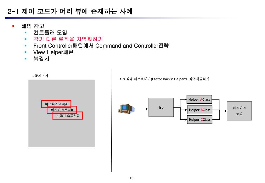 2-1 제어 코드가 여러 뷰에 존재하는 사례 • 프로젝트 개요 • 해법 참고 • 컨트롤러 도입 • 각기 다른 로직을 지역화하기 • Front Controller패턴에서 Command and Controller전략 • View Helper패턴 • 뷰감시 • 컨트롤에서 판단해서 JSP로 forward • Fat Controller 위험 JSP페이지 Controller 컨트롤Logic 컨트롤 Logic 포멧Logic 1.Helper 클래스에 위임하기 Helper Controller JSP페이지 포멧 Logic 컨트롤Logic JSP페이지 포멧 Logic 12 12