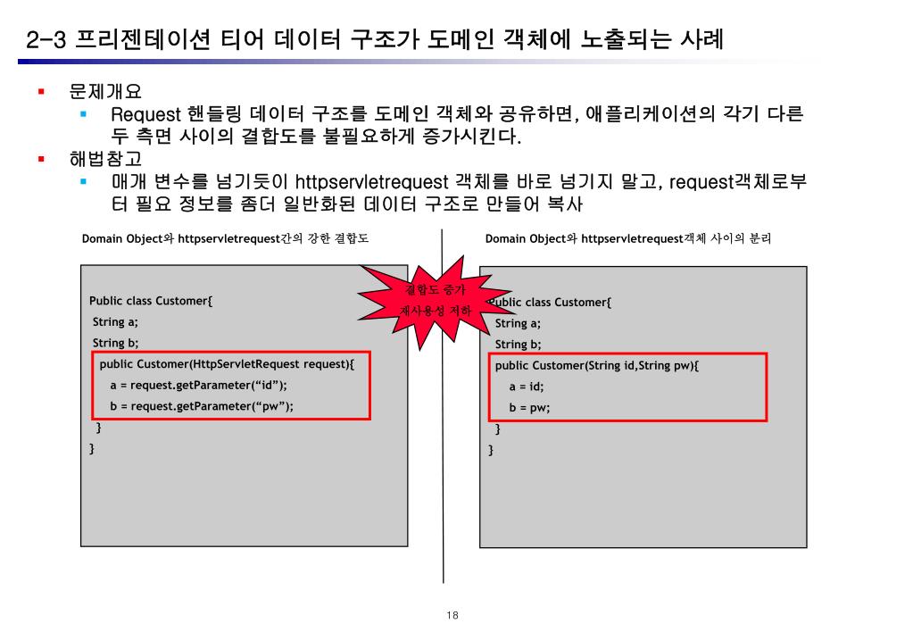 2-2 프리젠테이션 티어 데이터 구조가 비즈니스 티어에 노출되는 사례 • 프로젝트 개요 • 문제개요 • 프리젠테이션 티어 데이터 구조를 비즈니스 티어 혹은 그밖에 다른 티어와 공유하면, 티어 사이에 결합도를 심화시킬 뿐만 아니라 해당 서비스의 재사용성을 심각하게 감소시킵니다. 1.노출된 사례 2.노출을 막고 숨기기 Start()에 인자 추가시! 프리젠테이션컴포넌트 프리젠테이션컴포넌트 <HTML> <% Customer c = new Customer(); User u = new User(); u.setId(“aa”); u.setPw(“bb”); c.start(u); %> </HTML> <HTML> <% Customer c = new Customer(); c.start(id , pw); %> </HTML> • 일반적 데이터 구조로 복사후 사용 • 결합도 낮춤 • Tight coupling • 유지보수 저하 비즈니스 컴포넌트 비즈니스 컴포넌트 • Public Customer(){ • Public start(String a,String b){ • // 로직수행 • } • } • Public Customer(){ • Public start( User a){ • // 로직수행 • } • } 17 17