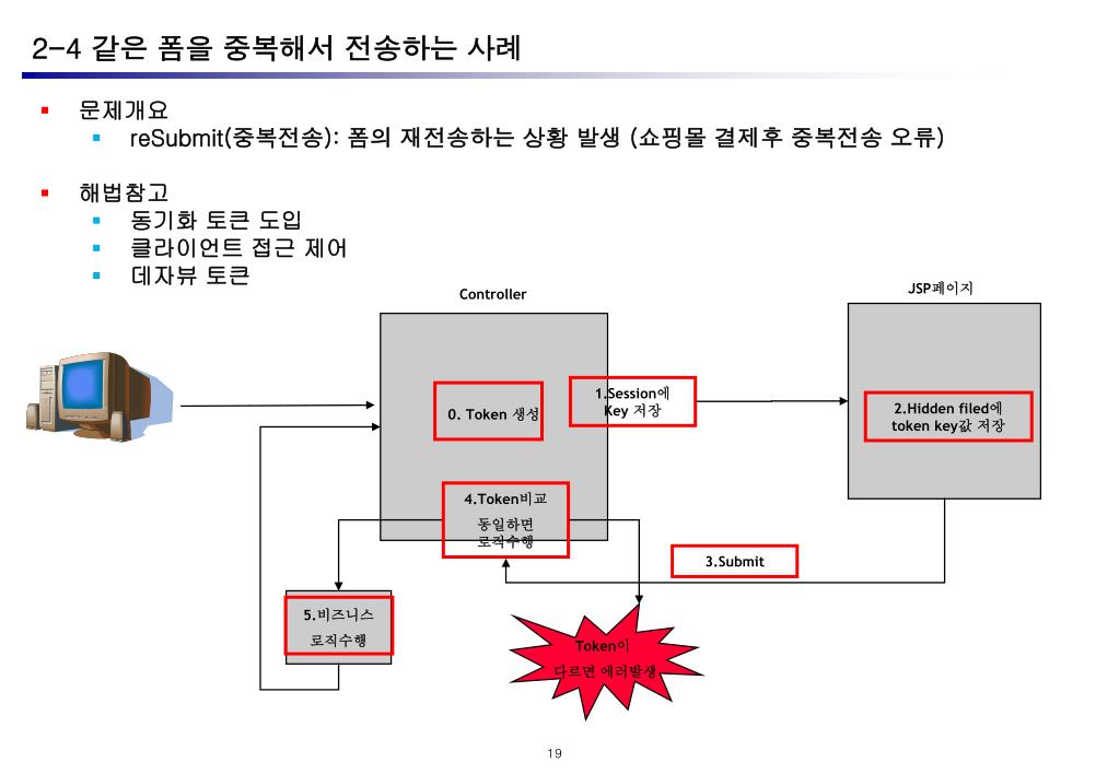 2-4 같은 폼을 중복해서 전송하는 사례 • 프로젝트 개요 • 문제개요 • reSubmit(중복전송): 폼의 재전송하는 상황 발생 (쇼핑몰 결제후 중복전송 오류) • 해법참고 • 동기화 토큰 도입 • 클라이언트 접근 제어 • 데자뷰 토큰 JSP페이지 Controller 0. Token 생성 1.Session에 Key 저장 2.Hidden filed에 token key값 저장 4.Token비교 동일하면 로직수행 3.Submit 5.비즈니스 로직수행 Token이 다르면 에러발생 19 19